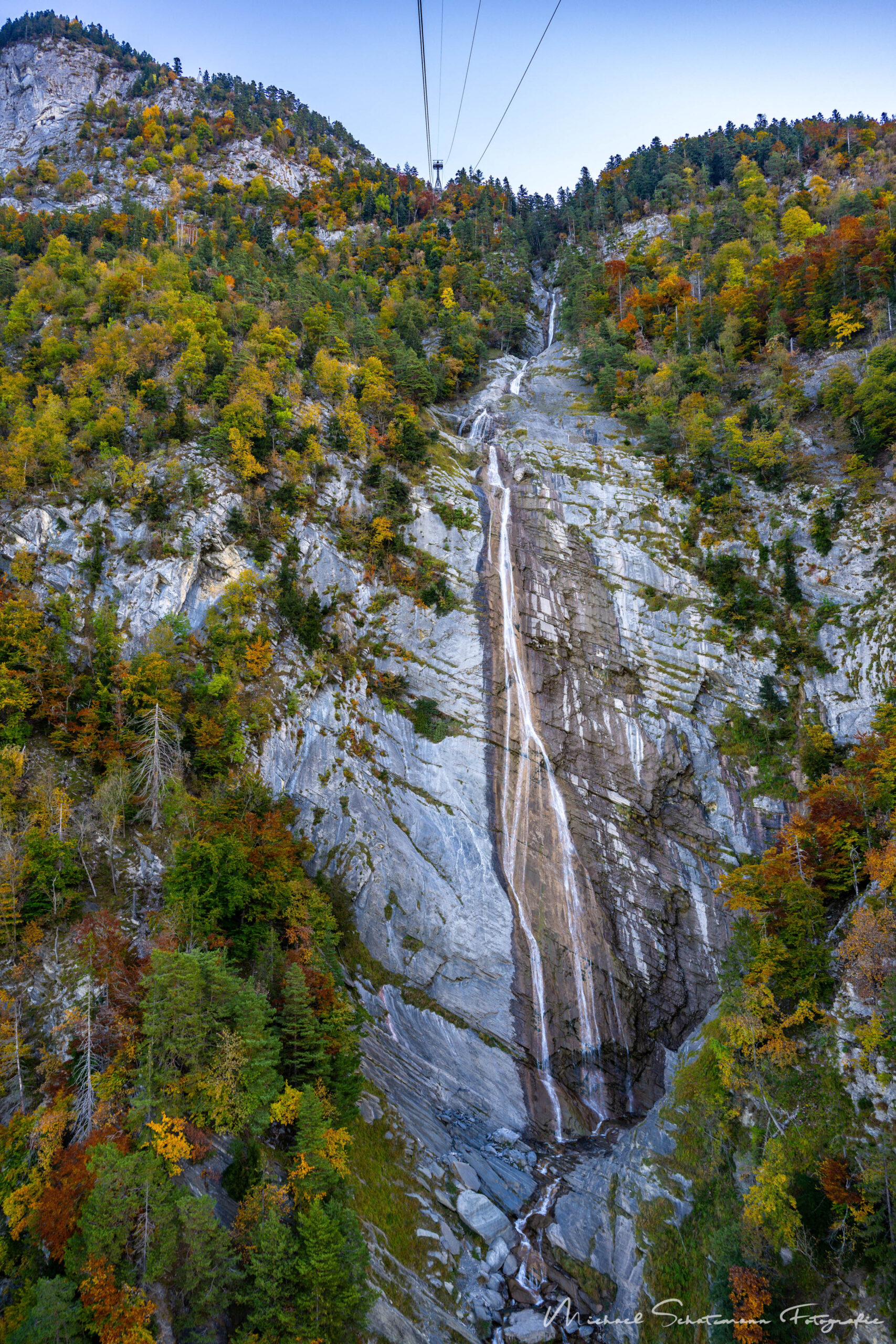 Die Höhendifferenz zwischen den Masten beträgt über 550m. Die Fahrt führt entlang und über den 140m hohen Ragnatsch Fall, der auch mit wenig Wasser noch eindrücklich ist. Bei Schneeschmelze oder nach einem Gewitter soll er wahrhaft imposant sein.