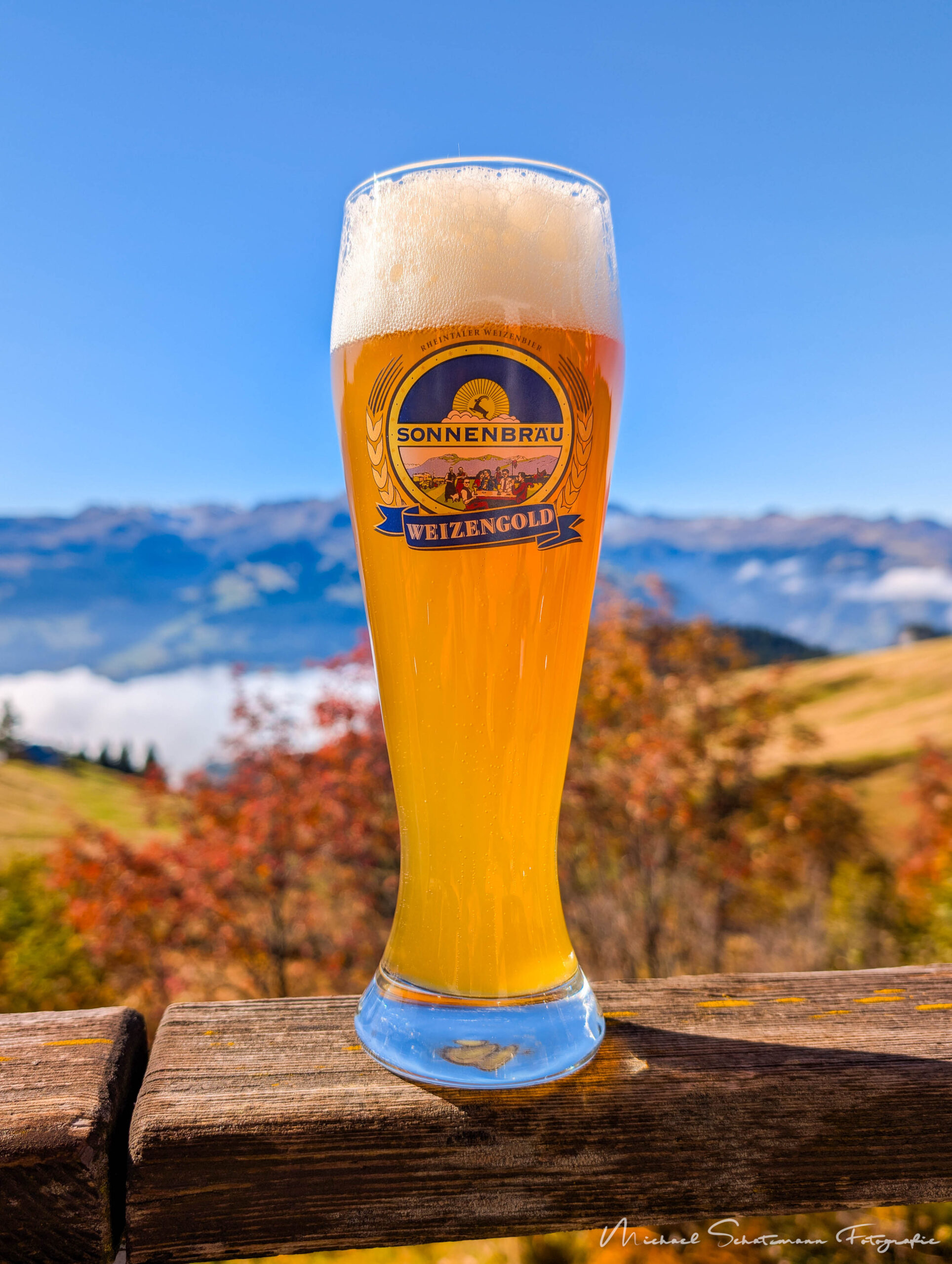 Dann muss man halt wo anders einkehren. Ich war schon fast dazu gezwungen, weil ich etwas frühzeitig wieder zurück war: Die Palfriesbahn hat über Mittag geschlossen. Also auf einen Wurst-Käse-Salat und ein feines Weizenbier ins Berghaus Palfries.