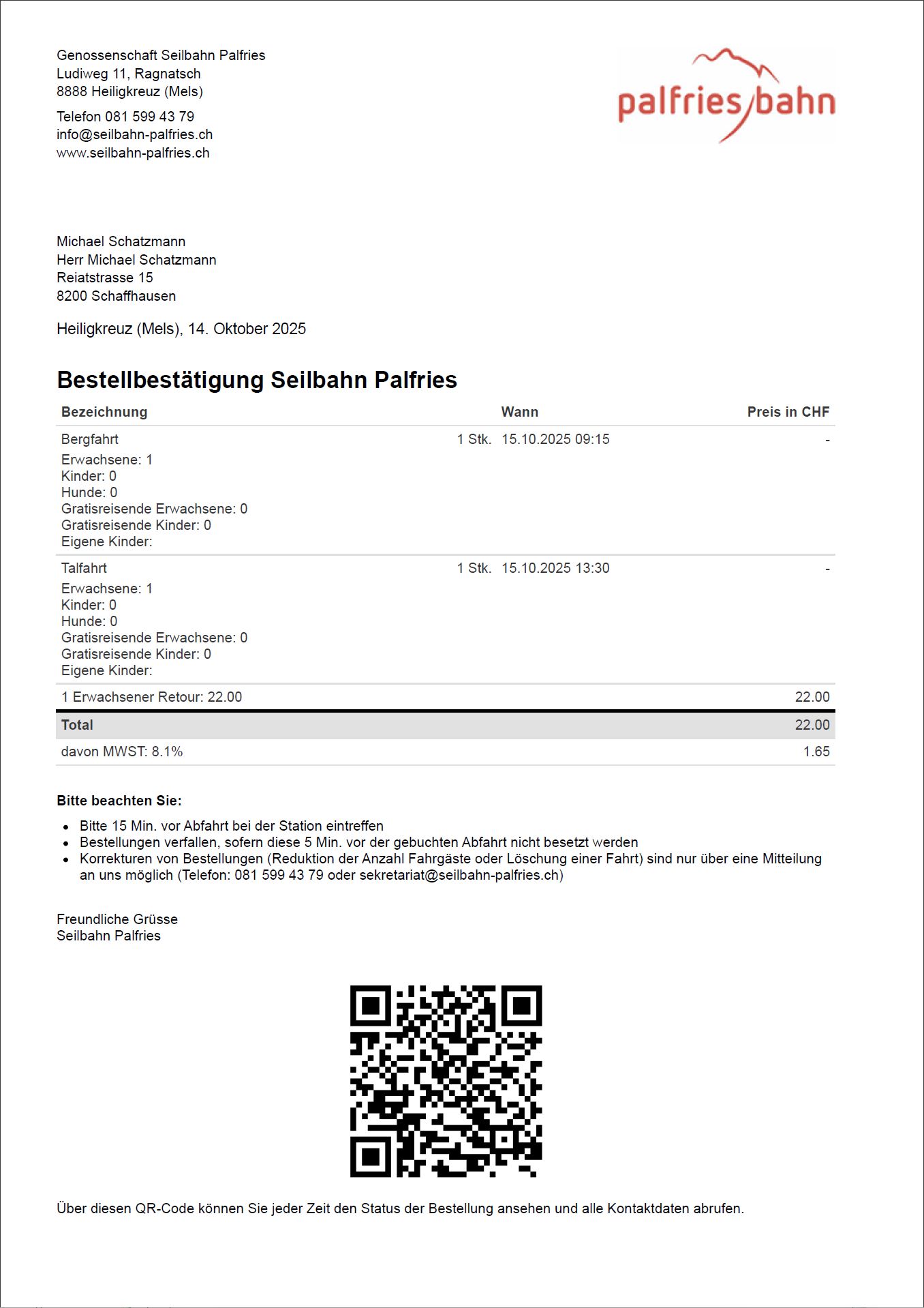 Die Kabinen der Seilbahn fassen aber nur 8 Personen und die lange Strecke lässt maximal einen Viertelstundentakt zu. Man muss seinen Platz also reservieren, sonst riskiert man schon mal längere Wartezeiten. Das geht aber problemlos über die Webseite der Seilbahn Palfries. Die verfügbaren Plätze sind für alle Fahrten ersichtlich und nach der Bezahlung gibt’s eine Bestellbestätigung mit QR-Code.